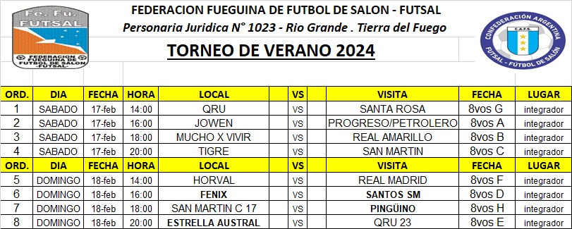 Desde este sábado 17 de febrero desde las 14 horas en el Gimnasio Integrador comienzan a disputarse los 8vos de final. A las 14 horas abren el fuego Qru vs Santa Rosa, después se enfrentan Jowen vs Progreso Petroleros. A las 18 juegan Mucho x Vivir vs Real Amarillo y cierran desde las 20 horas Tigre y San Martín. El domingo continúan los cruces de octavos de final. El valor de las entradas es de 500 pesos.