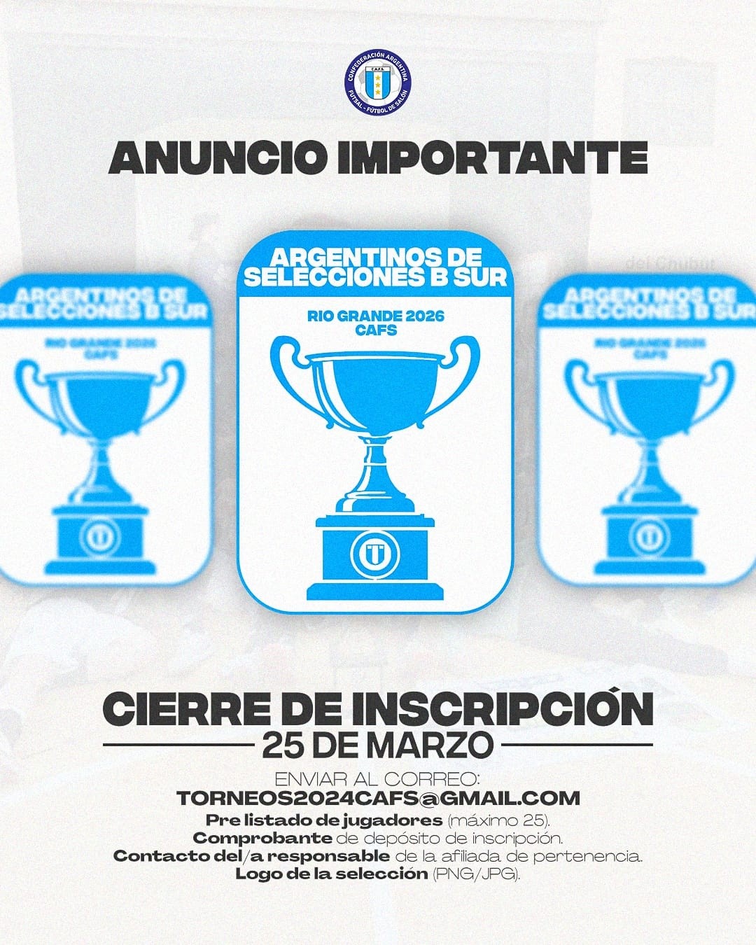 NACIONAL.- La Comisión de Torneos informa que el próximo 25 de marzo finaliza el período de inscripciones al Torneo Argentino de Selecciones B Sur que se realizará en Río Grande, Tierra del Fuego.
