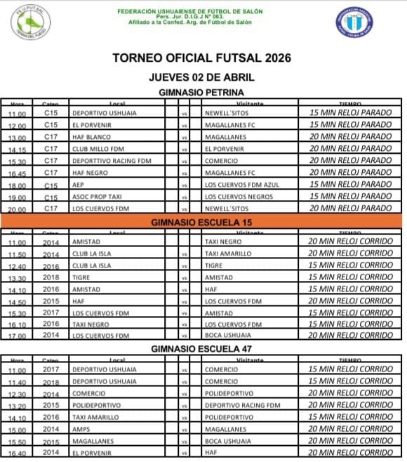 USHUAIA.- Pequeños, infantiles, promos y juveniles a pleno en este jueves 2 de Abril, dia en que se connmemora un nuevo aniversario de la Gesta de Malvinas. Desde Futsal Ushuaia te dejamos el fixture completo y un saludo con mucho afecto a nuestros queridos Veteranos de Guerra.