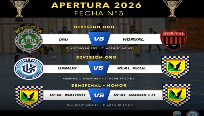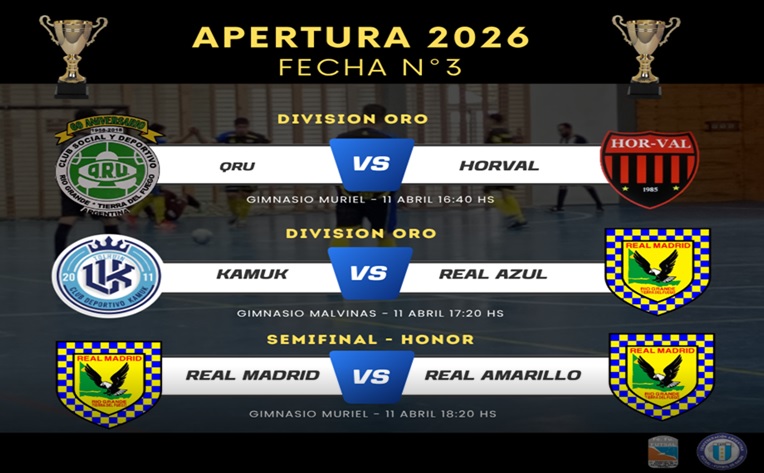 Este sábado 11 de abril en la categoría Oro se disputarán dos partidos. En el gimnasio Muriel, desde las 16:30 horas, se enfrentarán Qru y Horval. Luego, a las 17:20, en el gimnasio Malvinas, será el turno de Real Azul frente a Kamuk de Tolhuin.
