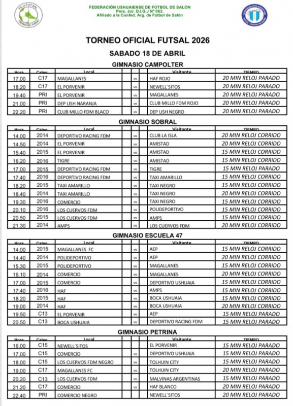 USHUAIA.- Debido a los pocos espacios disponibles para la disputa de encuentros, solo habra cotejos el dia sabado, divididos en Campolter, Escuela 47 de Andorra, Colegio Sobral y Petrina.