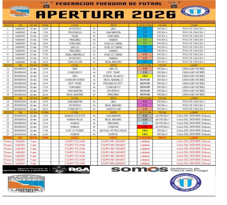 RIO GRANDE.- Programación de partidos a dispitarse este próximo fin de semana. Se juega el sábado en el Poli de chacra hasta las 20 horas. El domingo se juega en el gimnasio Muriel, poli de chacra y en la casa del deporte de Tolhuin.