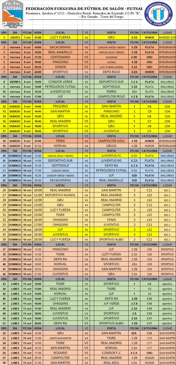 RÍO GRANDE.- Ante el pedido de algunos clubes por superposición de horarios en algunos partidos, la FFF, modificó el fixture a jugarse entre el jueves y lunes 11 de octubre. Las entradas se venden en los gimnasios y su valor es $200 (primera, C20, C17 y C15) y $100 desde C13 hacia abajo.