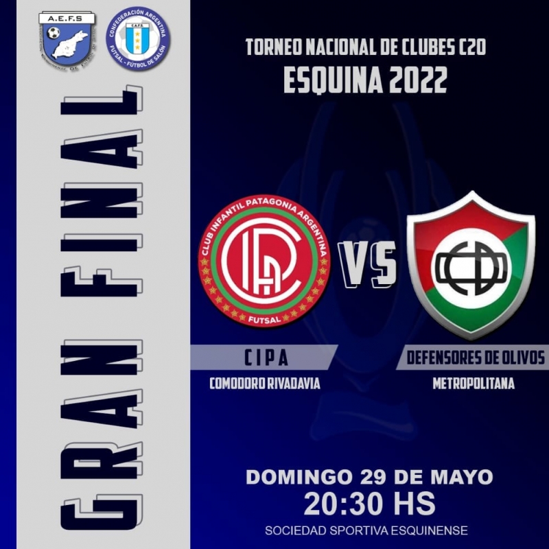 ESQUINA.- Este domingo CIPA de Comodoro Rivadavia y Defensores de Olivos de la Metro definirán el campeón del Torneo Nacional de Clubes C-20 que se está disputando en la ciudad correntina de Esquina.