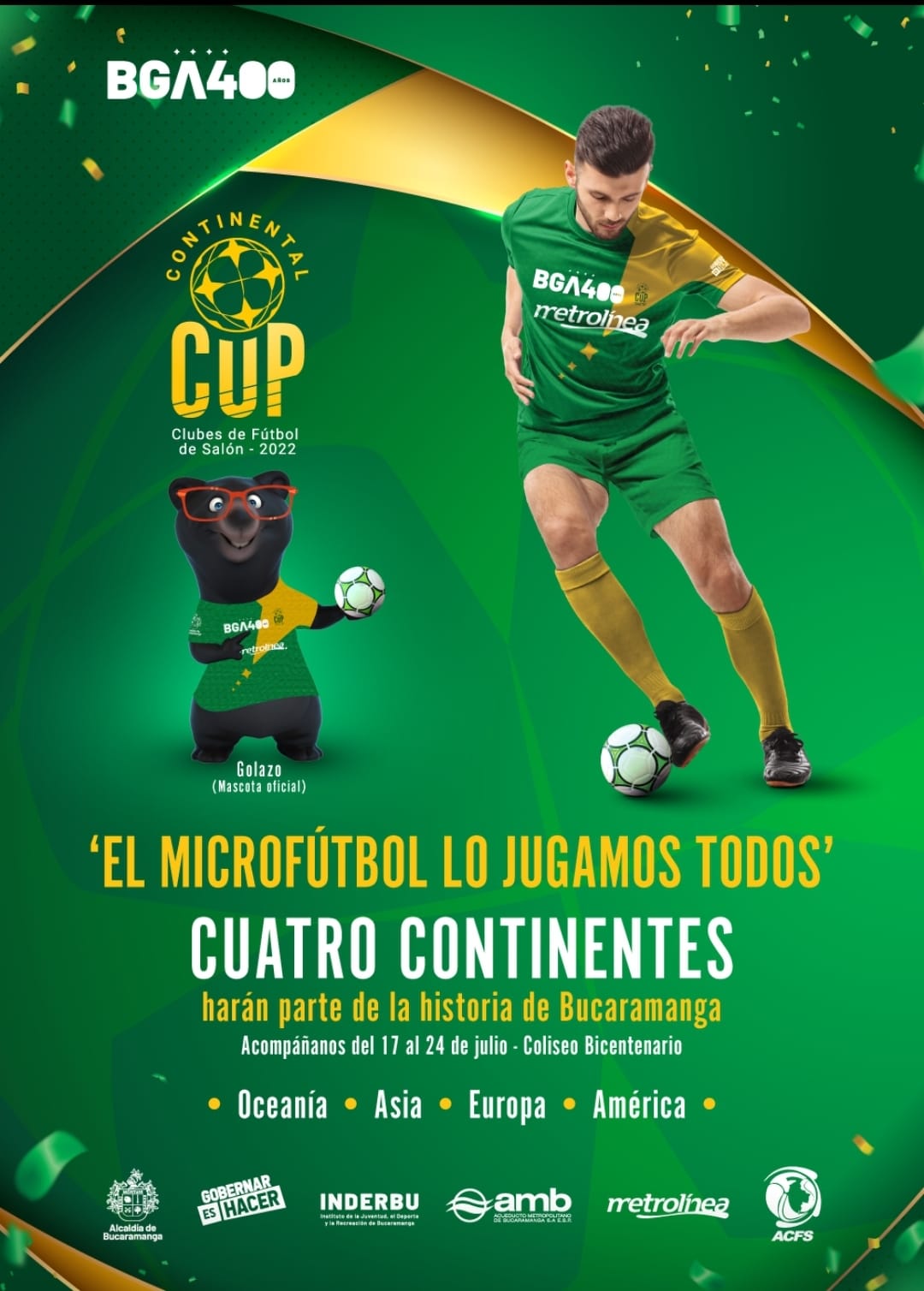 BUCARAMANGA.- Del 17 al 24 de julio, Bucaramanga se convertirá en la 'Capital Mundial de Microfútbol', cuando 12 equipos, de nueve países, disputen en el coliseo Bicentenario, la Continental Cup, evento que reunirá a campeones y subcampeones de las ligas de Clubes de tres continentes.