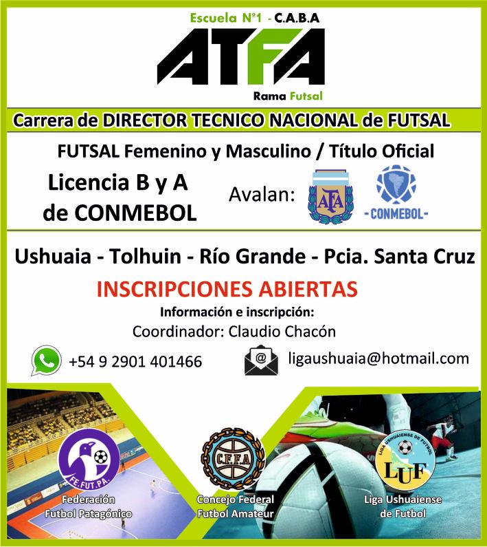 USHUAIA.- En Ushuaia, Tolhuin, Río Grande y Provincia de Santa Cruz, ya están abiertas las inscripciones para la carrera de Director Técnico Nacional de Futsal de la mano de ATFA.