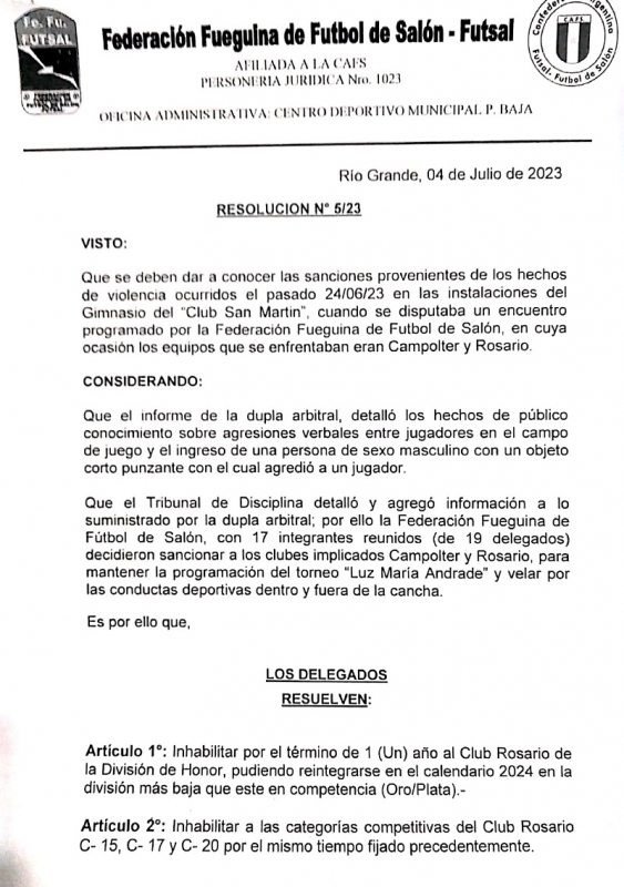 Sanción Club Rosario: Mediante Resolución especial la FFF inhabilito por 1 año al club Rosario pudiendo reintegrarse en el calendario 2024 en la categoría más baja. Además,
