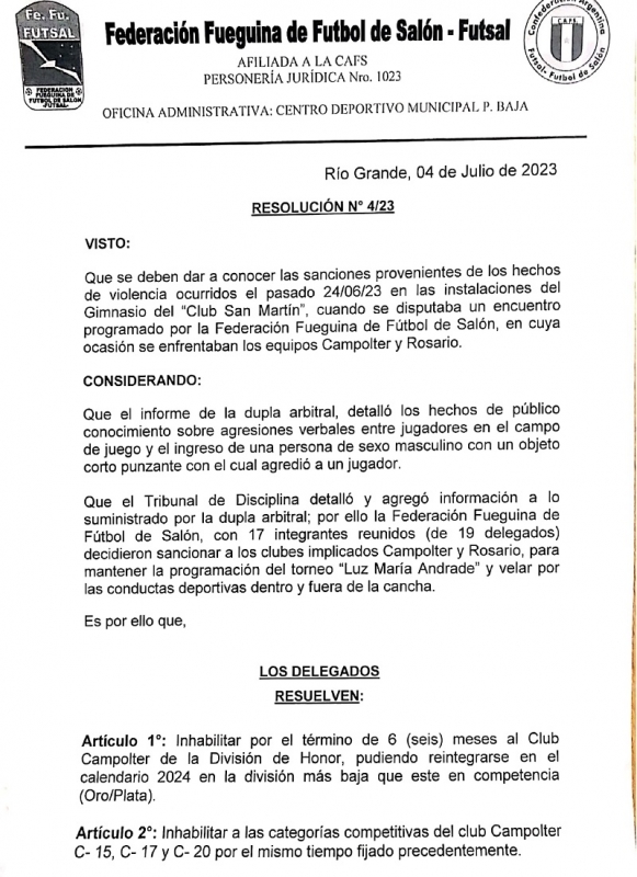Sanción Club Campolter: Mediante Resolución especial la FFF inhabilito por 6 meses al club Campolter pudiendo reintegrarse en el calendario 2024 en la categoría más baja.