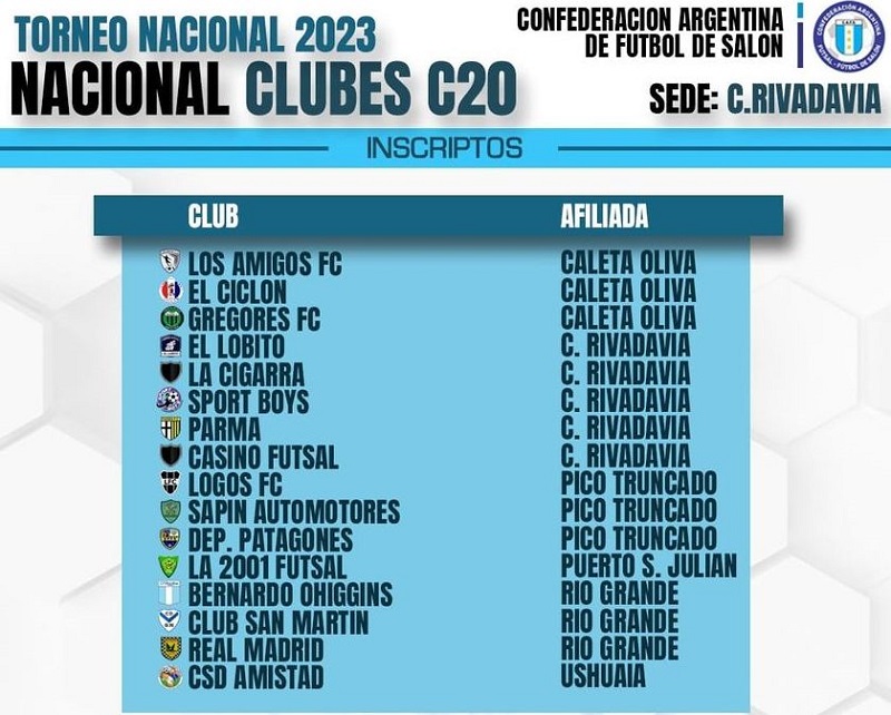 En cuanto a los argentinos de clubes lo más próximo es el de la categoría C20 “zona sur” a disputarse entre el 17 y 23 en la ciudad de Comodoro Rivadavia. En el mismo Río Grande estará representada por tres clubes históricos de la ciudad. San Martín, O’Higgins y Real Madrid, en este torneo también participan clubes de las ciudades de Caleta Olivia, Pico Truncado, San Julián, Amistad de Ushuaia y los conjuntos locales.